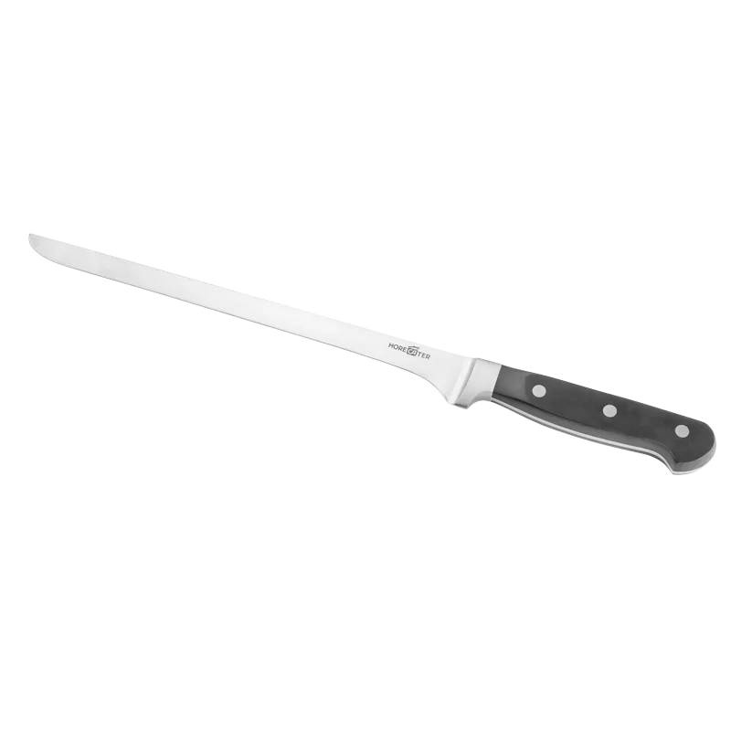 Posee una hoja larga, delgada y flexible que permite cortar con precisión lonchas de jamón o piezas grandes de carne. Incorpora un filo liso que ayuda a tener control sobre las piezas a cortar.